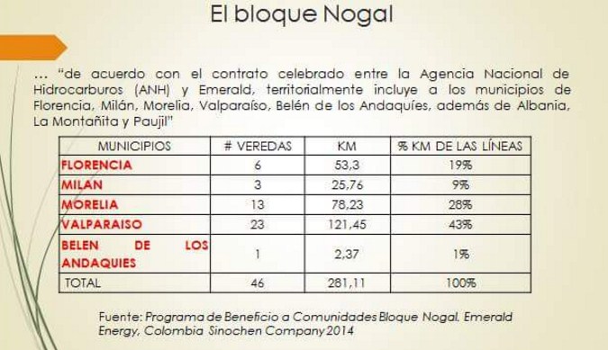 La comunidad campesina ha salido pacíficamente a impedir el paso de las camionetas y funcionarios al servicio de Emerald Energy, de esta manera exigen que se retiren de la zona y se mantienen prestos a reaccionar para impedir que las petroleras afecten sus ecosistemas hídricos. Se trata del Bloque el Nogal de la empresa Emerald Energy PLC que hace parte de los 43 bloques petroleros en el Caquetá con un 63% total del territorio.