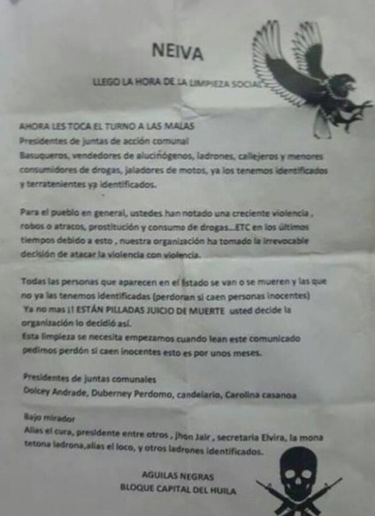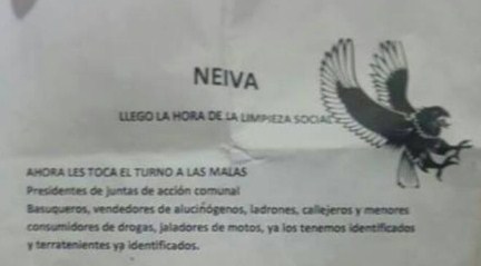 Un panfleto firmado por un grupo denominado, Águilas Negras, bloque capital del Huila, ha sido repartido en la ciudad de Neiva.