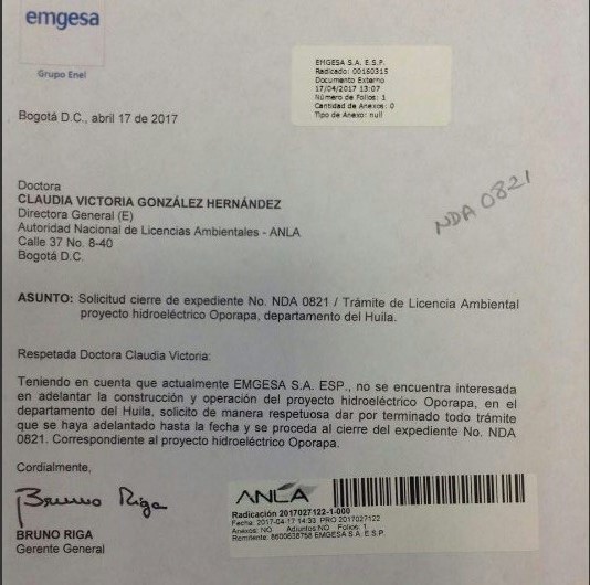 “Sin embargo, la respuesta de la ANLA genera incertidumbre debido a que le solicita a Emgesa precisar si la petición del cierre del expediente NDA 821, “se refiere al archivo del mismo con el fin de que esta entidad proceda a adelantar las actuaciones administrativas que se requieran” debido a que, según la ANLA, es improcedente dar por terminado el trámite administrativo que no ha iniciado porque Emgesa no ha presentado el Diagnóstico Ambiental de Alternativas”, concluyen el proceso de resistencia de Asoquimbo.