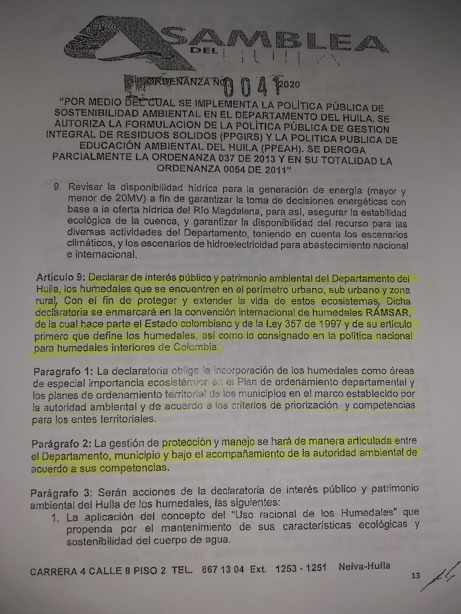A través de la ordenanza 0041 de 2020 la Asamblea del Huila declara patrimonio ambiental los humedales del departamento del Huila.