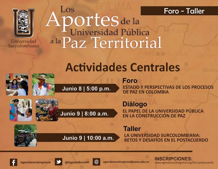 La apertura del foro es hoy, miércoles 8 de Junio,  en la  Universidad Surcolombiana desde las 5p.m. con el foro sobre el “estado actual y la perspectiva de las negociaciones de paz en Colombia”.