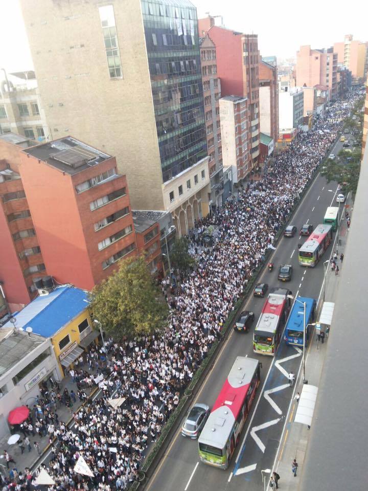 En Bogotá habían ríos completos de ciudadanos por sus calles, cantando y con arengas reclamaban a viva voz, “queremos paz, acuerdos ya”. Una de  las marchas con mayor asistencia registrada en la capital colombiana, surgida de iniciativa ciudadana, impulsada por jóvenes, motivada en redes sociales, espontánea y  con la esperanza de la paz. La plaza de Bolívar tuvo lleno total, banderas blancas se alzaban sobre el escenario. (Ver el video de la plaza)