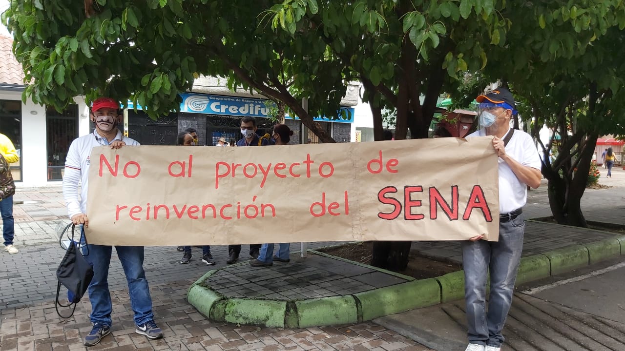 Situación que ha llevado a que aprendices e instructores realicen plantones, pues se rechaza que el SENA no asuma una educación presencial de calidad. Por el contrario, se convierten es una plataforma con educación virtual. La Central Unitaria de Trabajadores de Colombia, CUT Huila rechazo el proyecto de reinvención del SENA pues pone en peligro la estabilidad laboral, y la formación integral, favoreciendo a las multinacionales tecnológicas como mecanismo de privatización.