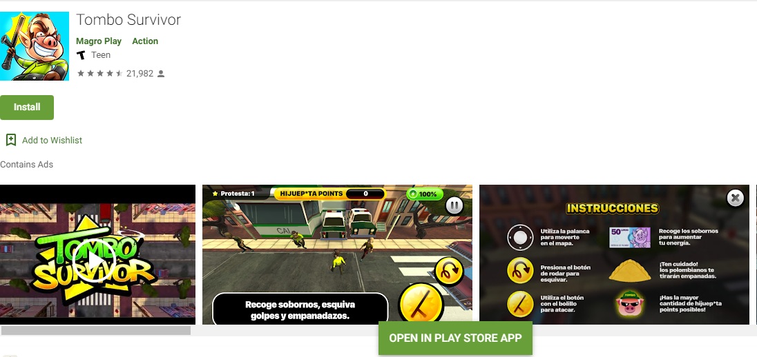 El vídeo juego que crítica la represión de la Policía, tenía un buen nivel de descarga desde de la tienda de PlayStore con una calificación de 4,5  y  ‎21.974 votos. “Este juego vas a encarnar el papel de un Tombo (Policía Corrupto) y tendrás que levantar a pata y bolillo a todos los civiles”, refiere la descripción del juego.