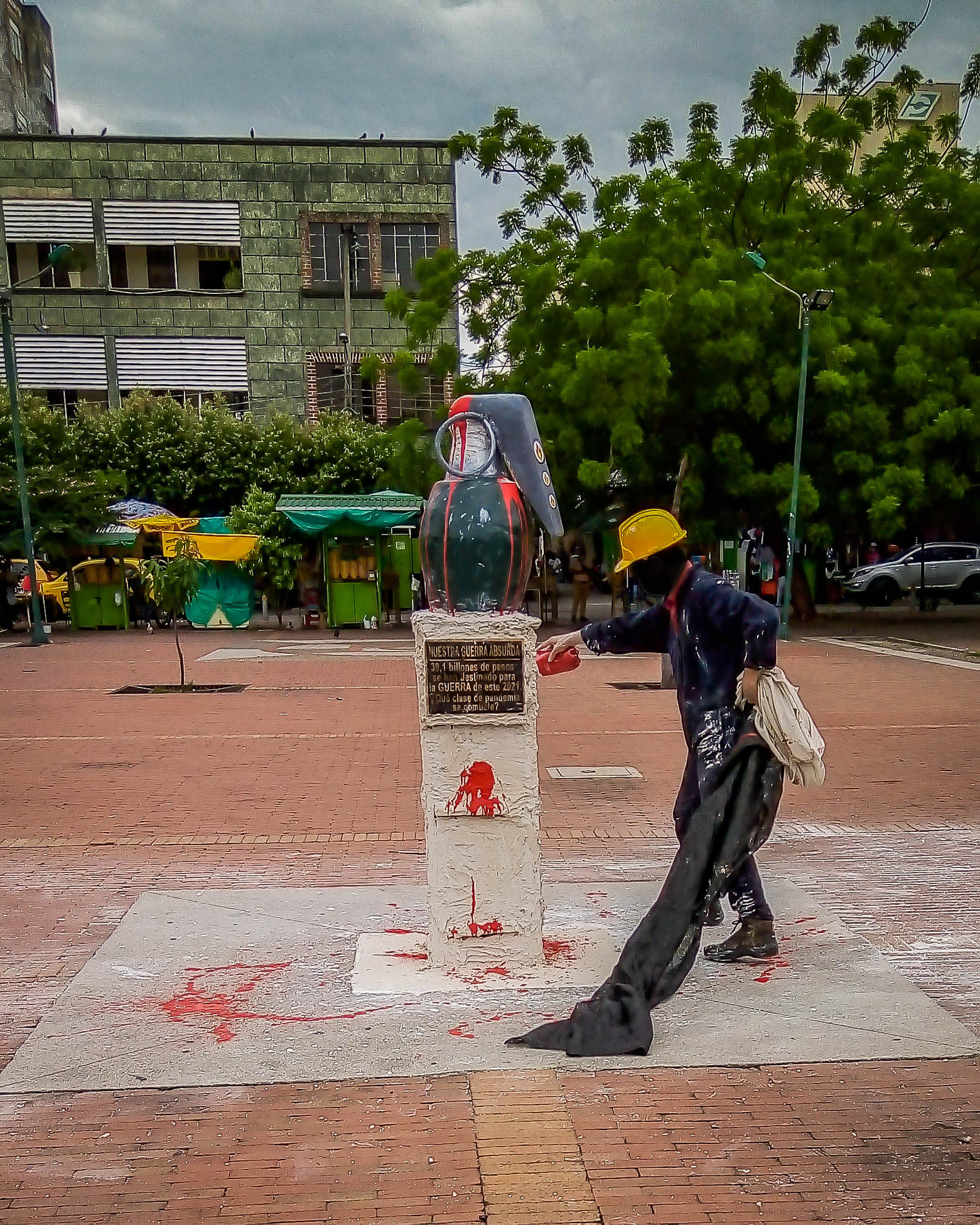 Un grupo de jóvenes del colectivo artístico, Tropel Errante construyeron un monumento denominado, “Nuestra guerra absurda” en contra la guerra y hace alegoría a una granada salpicada de sangre. De esta manera, simbólicamente hacen un llamado a rechazar los actos de guerra.