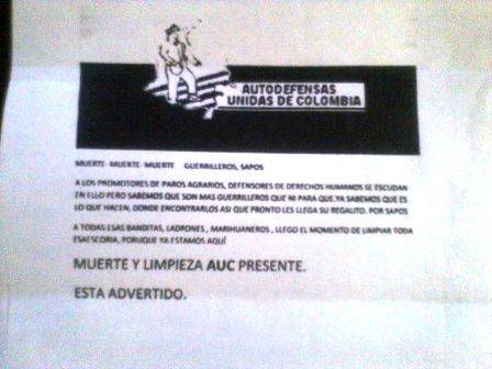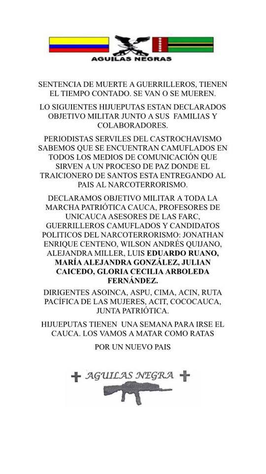 Con varios panfletos, presuntos grupos de Paramilitares amenazan a líderes políticos del Movimiento Marcha Patriótica y profesores. Así mismo son declarados objetivo militar, dirigente de Asoica, Aspu, Cima, Acin, Ruta pacífica de las Mujeres, Acit, CocoCauca y Junta patriótica