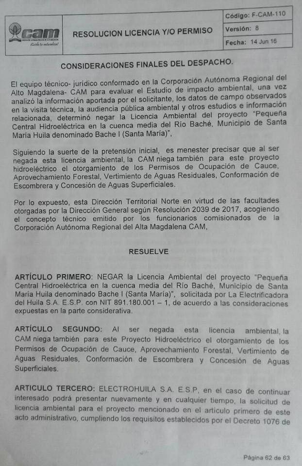 La Corporación Autónoma del Alto Magdalena, CAM  como autoridad  ambiental del Huila,  negó el 12 de febrero de 2018, la  licencia ambiental del proyecto: "pequeña central hidroeléctrica en la cuenca media del Rió Bache, denominado Bache I (Santa María)", solicitada por  Electrohuila S.A. Por lo tanto, Electrohuila no tendrá permiso para la ocupación del cauce, aprovechamiento forestal, vertimiento de aguas residuales, conformación de escombreras y concesión de aguas superficiales.