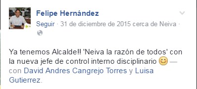 Ese mismo equipo, maquinaria de David Cangrejo, muy posiblemente impulsó la candidatura del hoy actual concejal, Felipe Hernández por Alianza Verde y que para ese entonces, se desempeñaba en la ESE teniendo como jefe a Cangrejo. Es por este episodio que la Fiscalía capturó a 13 personas, en cabeza de Cangrejo, el concejal Hernández y 10 funcionarios más, presuntamente por instar a los empleados a votar en las elecciones de 2015 a favor de determinado candidato al concejo de Neiva para conservar su empleo. Habría entonces un presunto manejo de recursos públicos de la salud para fines políticos. Por eso entre los delitos estarían, constreñimiento del electorado y participación política.